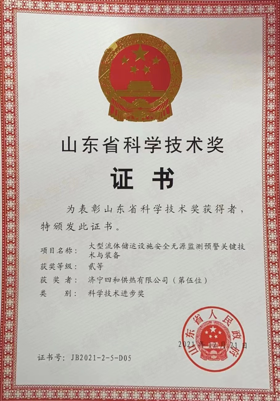 創(chuàng)新驅(qū)動發(fā)展、技術(shù)制勝未來。近日,山東省人民政府發(fā)布《關(guān)于2021年山東省科學技術(shù)獎勵的決定》,正式公布山東省科學技術(shù)獎獲獎名單,對為山東省科學技術(shù)進步、經(jīng)濟社會發(fā)展作出突出貢獻的科學技術(shù)人員和組織給予獎勵。濟寧四和供熱有限公司參與完成的“大型流體儲運設施安全無源監(jiān)測預警關(guān)鍵技術(shù)與裝備”項目名列其中,榮獲“山東省科學技術(shù)獎二等獎”。