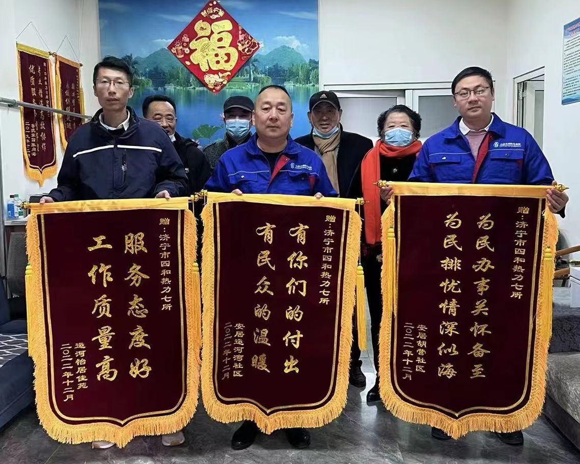 12月8日,胡營回遷一期、胡營回遷二期運(yùn)河灣、胡營運(yùn)河怡居佳苑三個(gè)小區(qū)的業(yè)委會代表以及胡營回遷一期唐營黨支部領(lǐng)導(dǎo)專程前往濟(jì)寧四和供熱有限公司供熱服務(wù)七所,將四面鮮紅的錦旗送到所長劉延春手中,感謝始終奮戰(zhàn)在供熱一線的工作人員的辛勤付出。