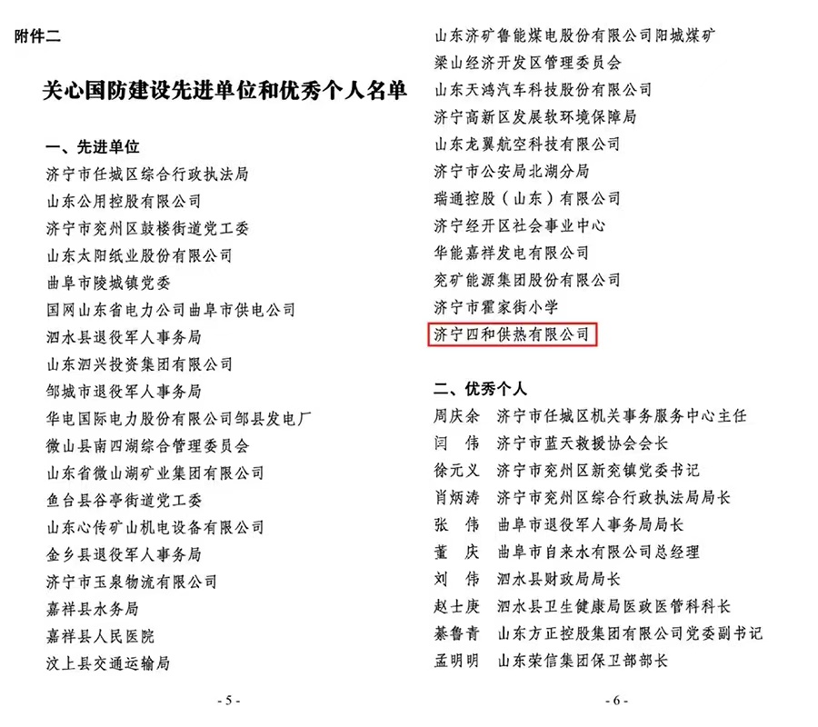 近日,中共濟寧市委辦公室下發(fā)了《關心國防建設先進單位和優(yōu)秀個人名單》,濟寧四和供熱有限公司榮獲關心國防建設先進單位榮譽稱號。