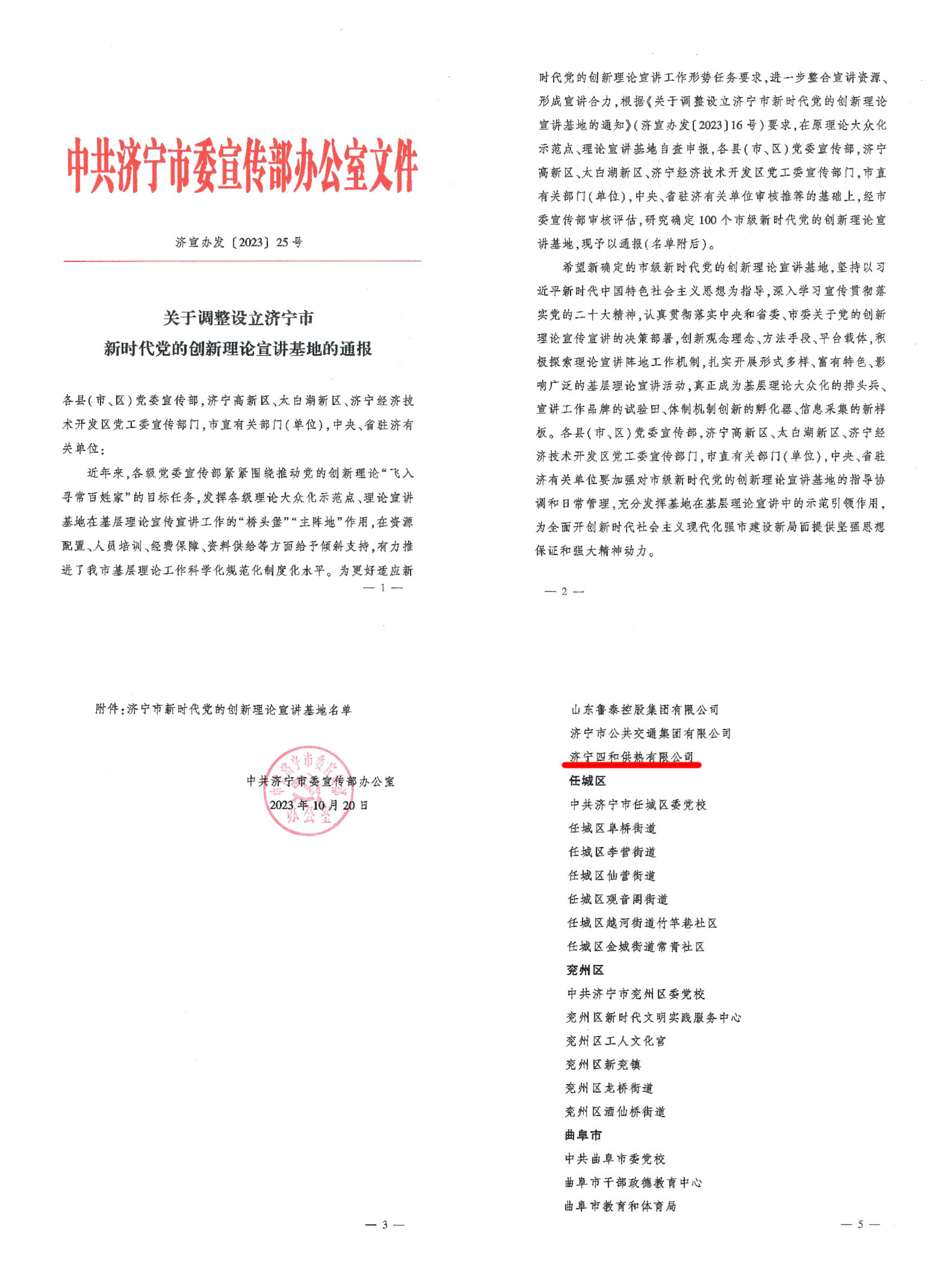 近日,中共濟(jì)寧市委宣傳部辦公室下發(fā)了《關(guān)于調(diào)整設(shè)立濟(jì)寧市新時(shí)代黨的創(chuàng)新理論宣講基地的通報(bào)》,對(duì)100個(gè)市級(jí)新時(shí)代黨的創(chuàng)新理論宣講基地予以公布。其中,濟(jì)寧四和供熱有限公司獲評(píng)“濟(jì)寧市新時(shí)代黨的創(chuàng)新理論宣講基地”。