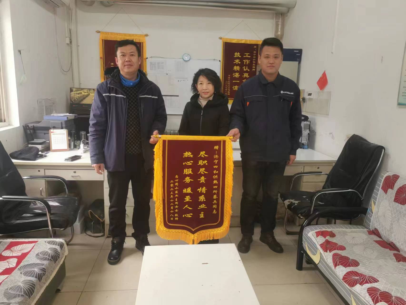 12月18日,忠心閘小區(qū)業(yè)主周女士專程前往濟寧四和供熱有限公司供熱四區(qū)域,對供熱區(qū)域網(wǎng)格員熱情周到的服務(wù)表示感謝,并送去了印有“盡職盡責(zé)情系業(yè)主 熱心服務(wù)暖至人心”字樣的錦旗。